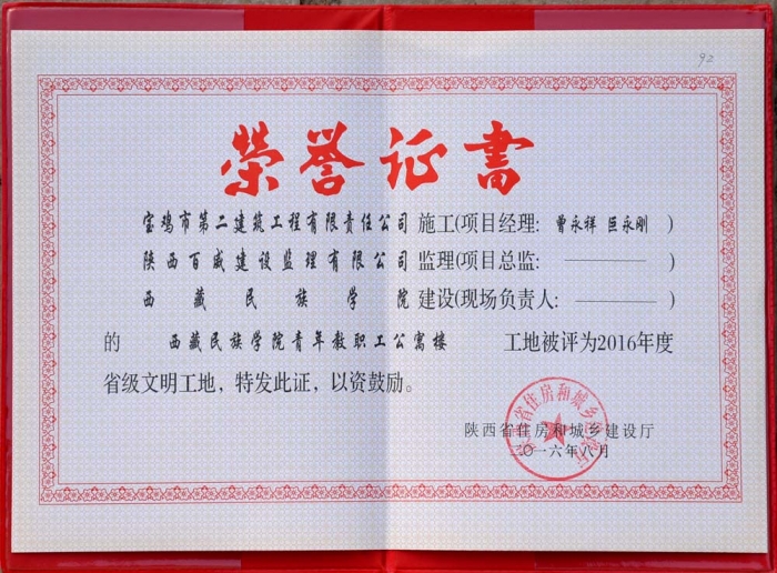 2016年省級文明工地(西藏民族學院證書)