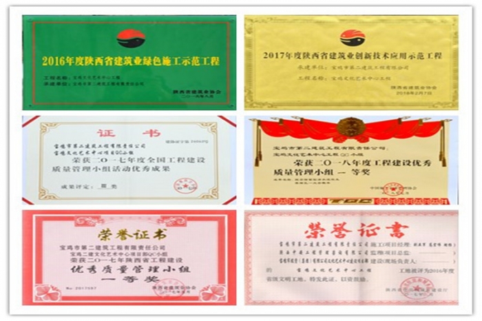 艱難困苦,玉汝于成。通過項(xiàng)目團(tuán)隊(duì)全體員工的共同努力,寶雞文化藝術(shù)中心項(xiàng)目先后被評(píng)為“2016年度寶雞市優(yōu)質(zhì)樣板主體工程”“2016年度陜西省建筑業(yè)綠色施工示范工程”“2016年度陜西省省級(jí)文明工地”“2017年度陜西省建筑業(yè)創(chuàng)新技術(shù)應(yīng)用示范工程”“2017年度陜西省建筑業(yè)優(yōu)質(zhì)結(jié)構(gòu)工程”;項(xiàng)目部先后榮獲全國(guó)工程建設(shè)質(zhì)量管理小組活動(dòng)成果獎(jiǎng)4項(xiàng)、陜西省工程建設(shè)優(yōu)秀QC小組成果獎(jiǎng)7項(xiàng),申報(bào)陜西省省級(jí)工法1項(xiàng);項(xiàng)目部先后榮獲公司先進(jìn)黨支部、先進(jìn)單位、經(jīng)濟(jì)貢獻(xiàn)特別獎(jiǎng)單位、“安康杯”安全文化知識(shí)競(jìng)賽活動(dòng)二等獎(jiǎng),規(guī)劃局系統(tǒng)先進(jìn)黨支部等榮譽(yù)。