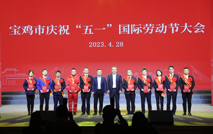 4月28日,在寶雞市慶?!拔逡弧眹H勞動節(jié)大會上,集團公司李紅軍同志被寶雞總工會授予五一勞動獎章,并上臺領獎。(左三)